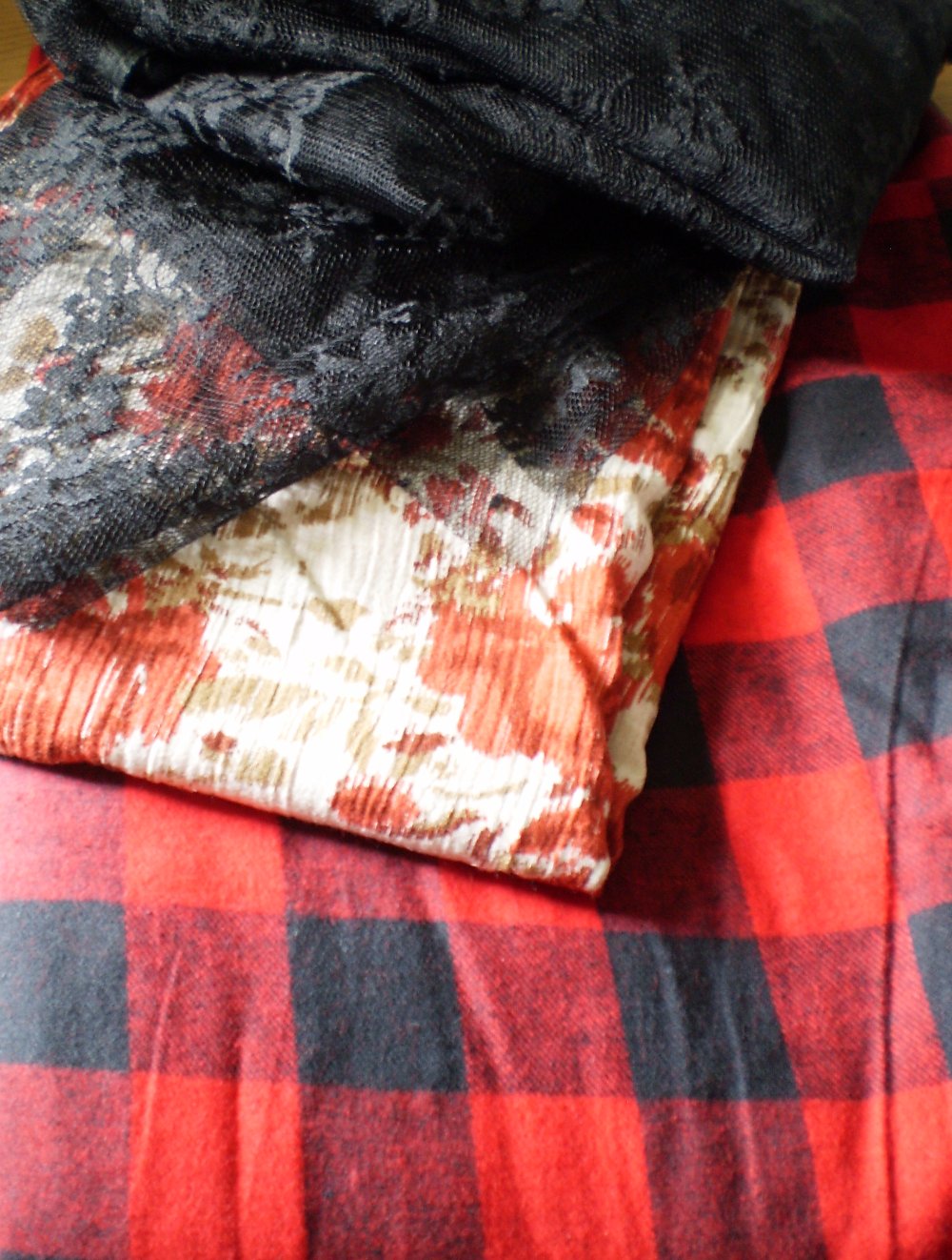 I have a bunch of plaid brushed cotton to make lumberjack-inspired panties out of with bits of Chantilly lace. And, on my most recent trip to Fabricland I found a beautiful piece of crinkled cotton with a vintage looking rose print on it. I can’t wait until I have time to sew it into a nice peg-top skirt or structured shrug or something.