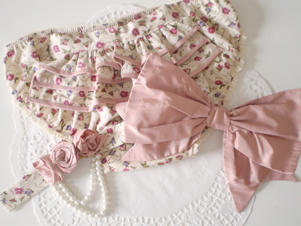 I made a pair of simple cotton panties with three clear, nylon snaps on the back, then made some “Accessories” to snap on and off; a bustle trimmed in silk, silk rosettes and pearl drops, and a gigantic taffeta bow.