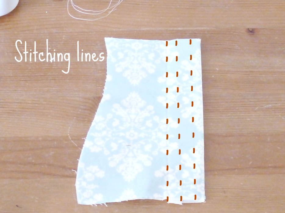 Stitch along the edge of your facing. Stitch another row ⅜” in from that (towards the center back), and a 3rd row of stitching ⅜” in from your center back line. You will now have 2 casings for bones, on either side where your eyelets will go. This will reinforce your eyelets and prevent them from pulling or popping out.