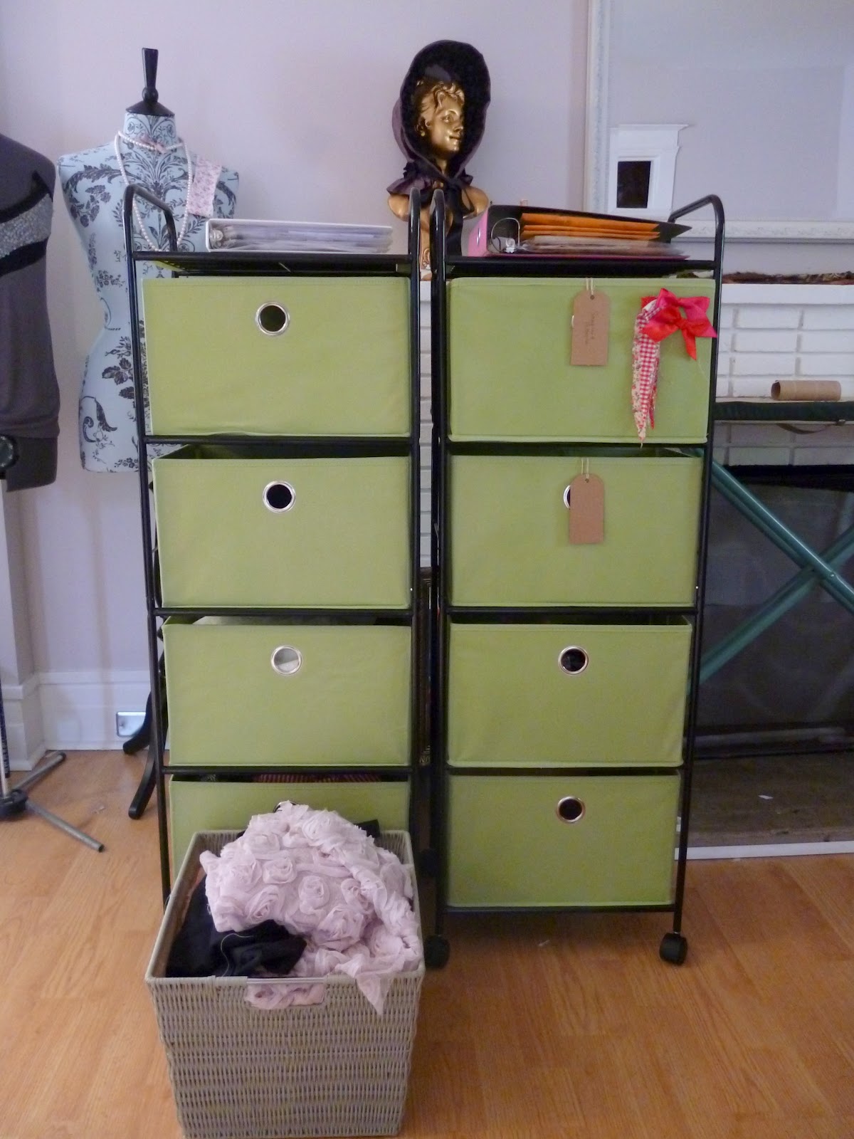I put all of my sample garments in one drawer, all of my packing supplies in another. All of current collection’s fabrics live in these bins, so I no longer have to run around like crazy looking for “That piece of pink satin that I’m SURE I bought last week…”