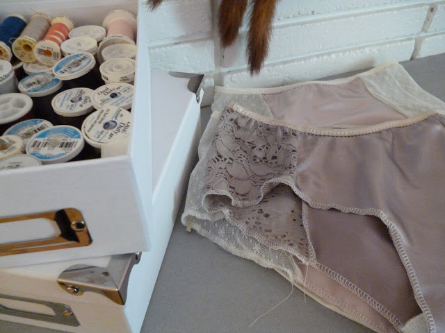 It has remained relatively neat, tidy, and usable. It is so nice to finally have a real “place” for all of my stuff. I have a home for my piles of satin, a box for all of my thread, a drawer for all of my foldover elastic… When I need something, I know right where to get it, and where to put it back when I’m done. I had moved so much over the last 8 years of my life that I never bothered really setting up a system for my stuff. Now that we are settled in the house, it is so nice to find a real place for all of my stuff!