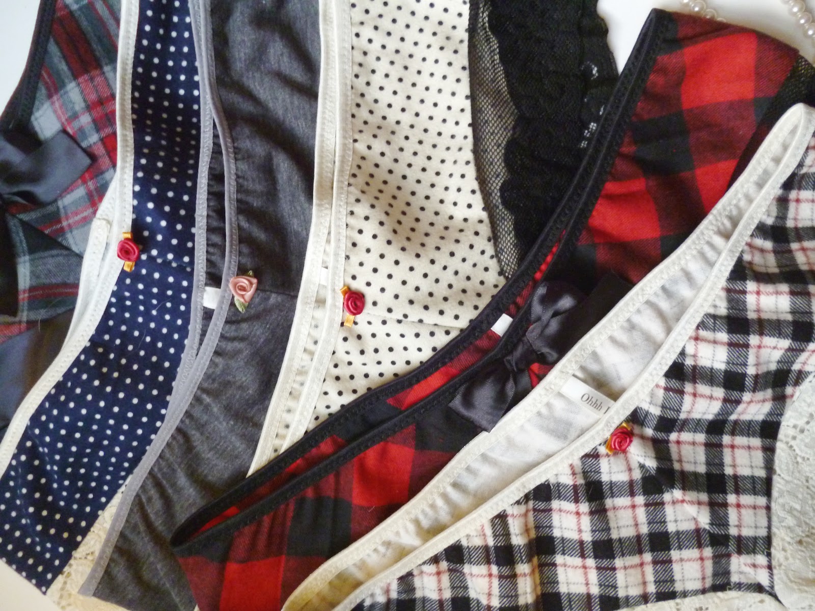 To cut down on bulk, I finished many of these off with small satin rosettes.  I’m going to be adding a satin bra in black & ivory to mix and match with these bottoms.  I can’t wait to get some shots on a model to show you how adorable these look on!