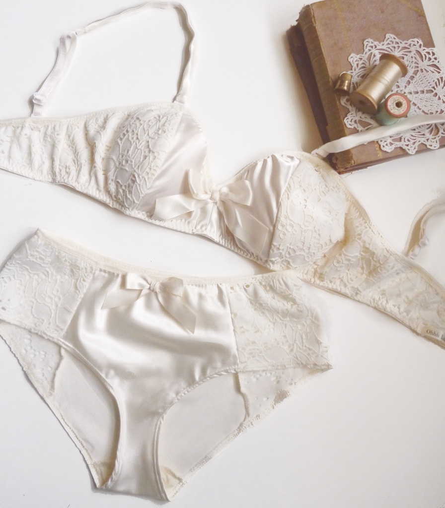 She also wanted a ivory bra and panties set.  This bra has removable straps, and light padding and is made to match my ivory satin cheeky panties. It was my first time doing removable straps. I was a little worried because I had a hard time finding the removable hooks that were small enough, but I think they actually camouflage in nicely.