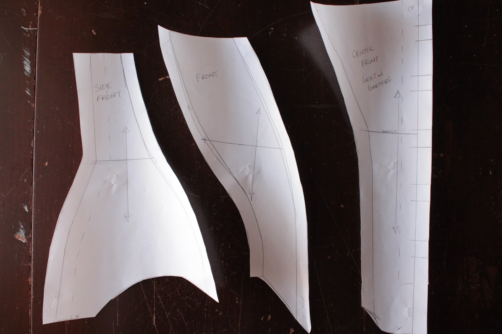 I was inspired by the shape of early 1900’s corsets, with the curved seams and flat front.  When you look at a close up of this style of corset, it has s-shaped seams, but the bones run up and down, not following the seam lines.  This was a little different from the standard princess-seam corsets I had sewn before.