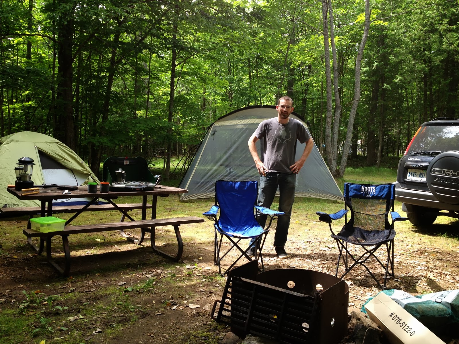 The first day, we didn’t do much other than set-up camp, which is more involved now that we have a dining tent in addition to our sleeping tent… Dan decided he wanted to try his hand at a bow drill to make fire, so he scavanged some twigs and sticks from the bush, and was able to make lots of smoke, but not so much fire. Luckily, we also brought a lighter to start a fire!