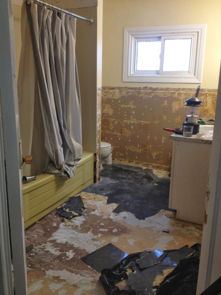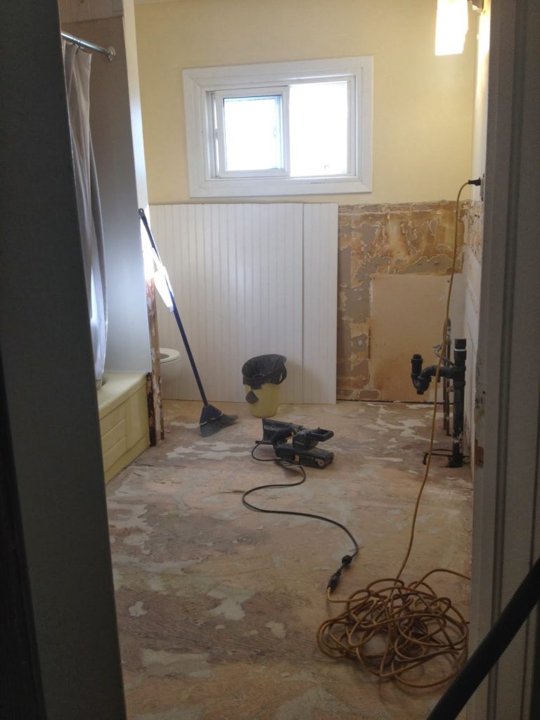 Last Saturday, Dan and I started tearing apart our bathroom.  We planned to put down new flooring, beadboard panelling over where we took down the tile, new baseboard and chair rail, a new vanity, and paint.  In my head, somehow I thought we could do much of this work over a three day weekend.  I don’t know how I thought we could do that, but in my head it all sounded like it would work out.  Having never demolished a bathroom before, I didn’t realize how LONG that process is.  I spent an entire day using a belt sander to try to get the old linoleum off the floor.  Basically, it took two full days of working just to get everything out, and we didn’t even touch the toilet or bathtub (those two fixtures are staying). Since we do only have 1 bathroom, I was in a bit of a rush to try to get it in at least working order again… that is one downside of DIY-ing and 1 bathroom living (other wise, we don’t have much need for a second bathroom, but I didn’t really realize how inconvenienced I would be without a sink and mirror for a week!)