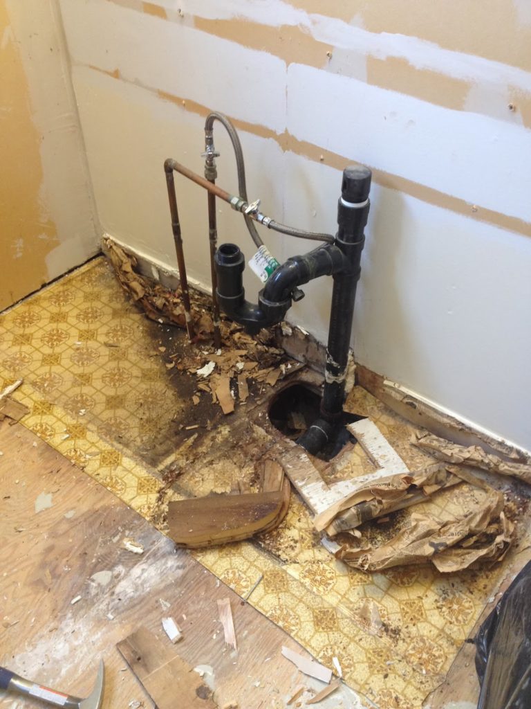 Our bathroom obviously has hardly been touched since it was originally installed, and as a result, we found a number of “issues.” There had been a leak behind the faucet of the tub, a leak under the sink… all of which had gotten repaired at sometime but never properly cleaned up, which meant Dan and I had a lot of really gross clean up to do.  I think this is one of the downsides of buying a house that had been used as a rental for 20 years or so.  Things get patched and mended, but nothing gets done right.  Tenants may not tell landlords about an issue until it’s really out of hand.  Case in point, here’s what we found after we pulled out the old vanity.  A nice big hole in the floor, mildew, and other unnamed horrors.
