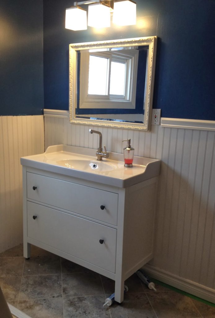 One of the biggest problems we ran into was installing our vanity and sink which was from Ikea.  Finding a reasonably priced vanity is not easy, and we looked all over.  I wanted something a little different and because our bathroom is quite large, we needed something that was proper scale for the space.  At the same time, we didn’t have much money to spend on this project so Ikea seemed like the best bet.  Something we (stupidly) didn’t account for is that our plumbing comes straight out of the floor.  I’m not sure why we didn’t think of this, but basically all of Ikea’s vanity’s have an open bottom or are floating. In hindsight, many of the vanities that we looked at at Home Depot, Home Hardware, etc, has open bottoms.   In the end, we ended up being ok.  My genius husband turned some pipes, worked a little magic, and voila! The the plumbing sits perfectly in the space behind the drawers and unless you get down on your hands and knees, you can’t even see the pipes underneath.  This did make attaching the sink plumbing quite a bit more challenging, but luckily my husband is basically a genius and figured out how to make it work.  I couldn’t even figure out how to assemble the Ikea pipes (plumbing is not my “thing,” I have learned).
