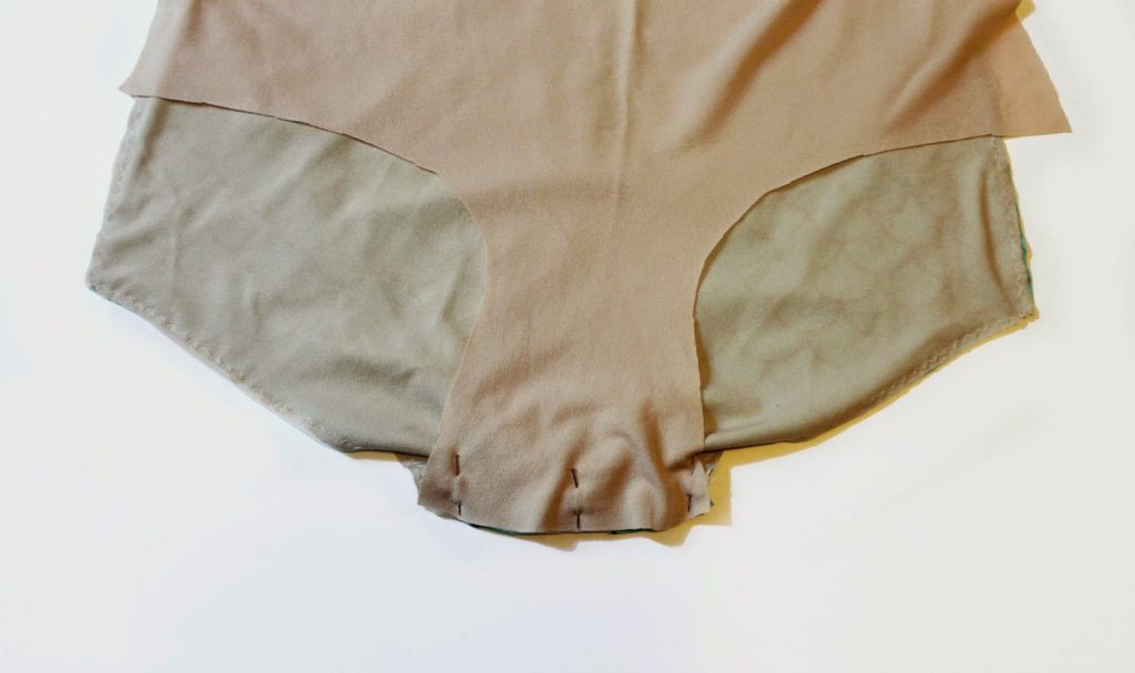 3. With Right Sides facing together, sew your Front Self along the curved crotch seam to the Back Self & Lining. Seam Allowances are 1/2″.