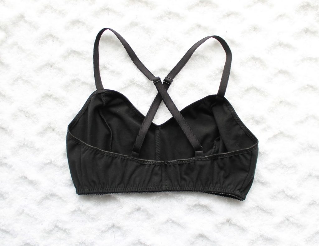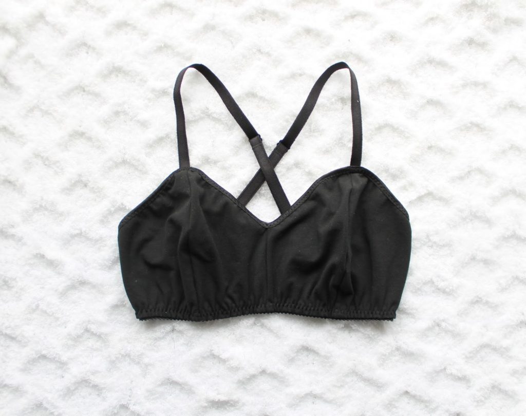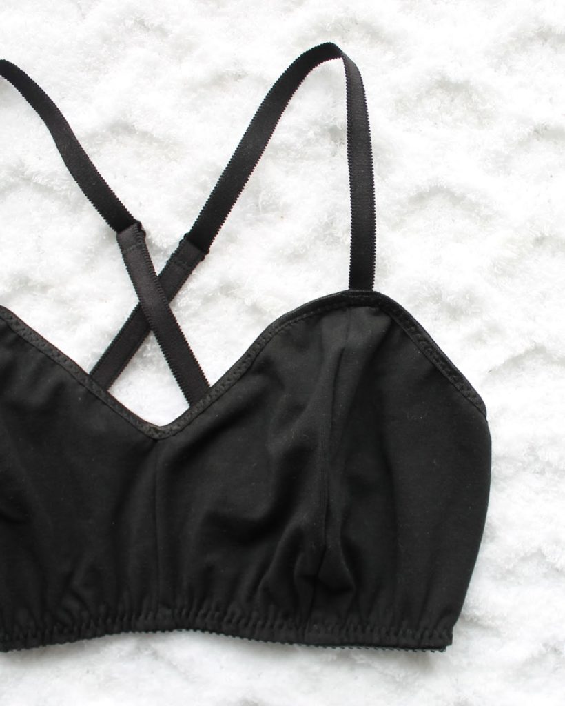 A couple months ago, I needed a racer-back style bra for under a specific top I wanted to wear. So, I made a Jasmine Bralette for with criss-cross straps, and no back closure, just pull on style in natural organic cotton jersey, and it quickly became my favourite bra. I seriously would wear it for days, without it coming off… I figured I’d better make one in black too, since black tends to be the colour you will find me in most! Being heavier chested, I like the criss-cross straps in the back I feel like it evens out the weight of the bust across my back better. It’s an easy alteration to make to the Jasmine Bra – just make slightly longer straps, and cross ’em in the back. I used 1/2″ strapping, which works fine for me, but I kind of wish I could have used something a little wider… I just didn’t have any in stock!