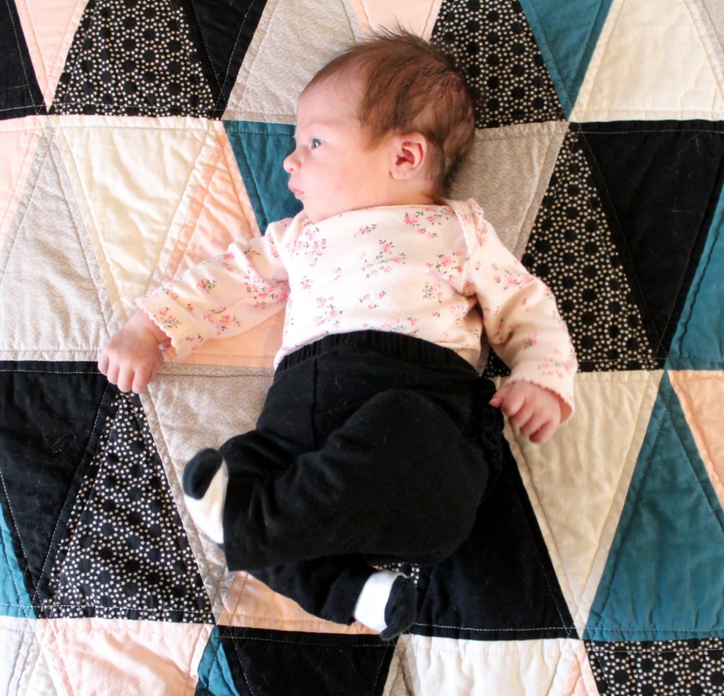 I can not understand the colours, for years I adore your pastel colours and combinations that are so special and cheering. Now your baby girl is wearing black, it seem stressful even your baby and look at the shape of the quilt she is on, it is scary shape of coffin, maybe it is only impression but I feel sorry for the baby.