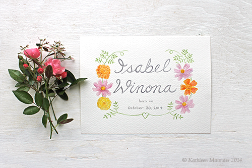 I’ve been so lucky to have so much support throughout the last few weeks, from friends & family near and far.  On Monday, I checked the mail and found a surprise package from my friend Kathleen.  She painted the beautiful piece for us below.  I absolutely love it, and can’t wait to frame it up and hang it in the nursery! Kathleen wrote about her process for this piece on her blog.