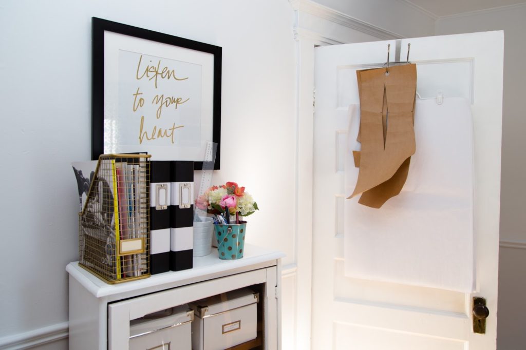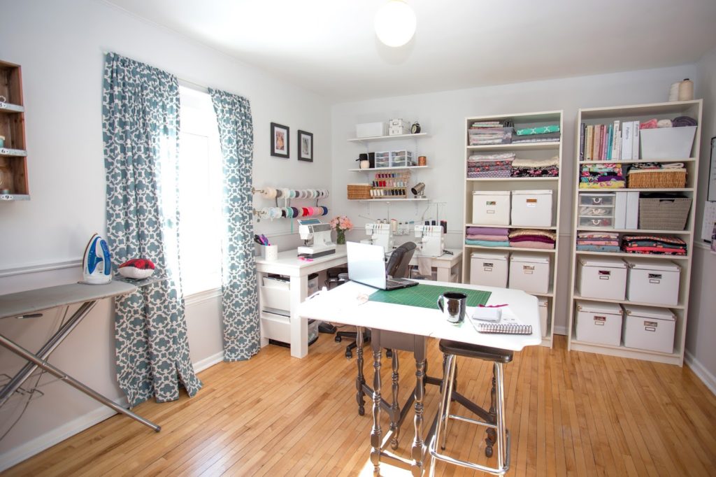I mentioned a while back that I re-did my studio. Previously, it was painted a horribly depressing beige… the walls were cracked, and it was generally a pretty ugly space. So, with the help my my BFF Abbey, we patched the cracks, painted furniture, evened things out, and painted the walls (two shades of) white.  I used all of the furniture I had in there before, which was an antique table from an auction sale, two Ikea book shelves, and a custom built sewing L-shaped table (got it as part of a trade). I added a small vintage cabinet to store boxes and odds and ends, as well as two rods to store spools of elastic. The new layout is SO much better, with the cutting table in the centre of the room.  Overall it just feels so much brighter and inspiring. I really, really love being in this room now. I like it so much, I now want to paint everything white! It just looks so good, especially in a house like ours, which is pretty dark (small windows).