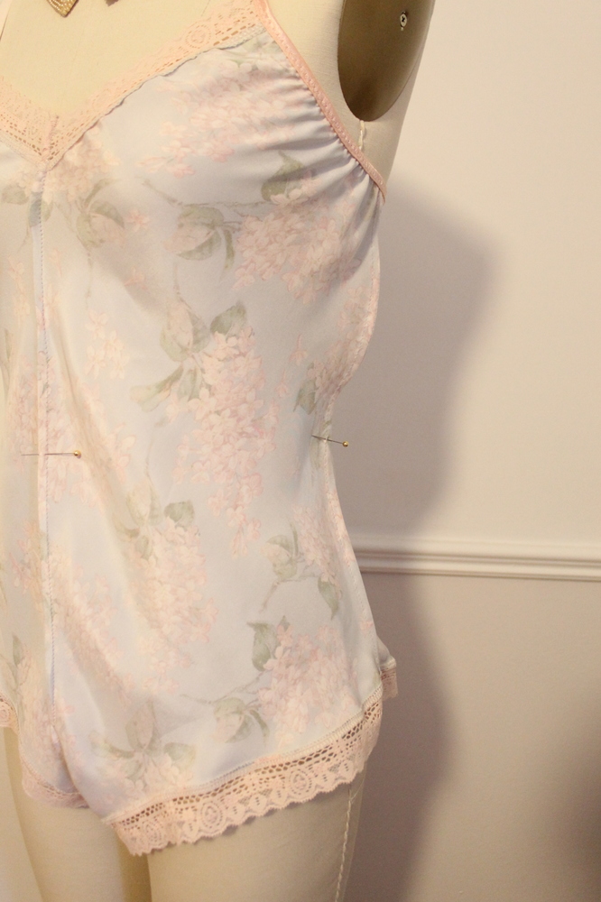 7. Sew lace onto the right side of the garment. Turn seam allowance under and press. Top stitch in place. An extra pretty way to finish the leg openings would be with appliqued lace. Check out my hero, Carine Gilson for some dreamy inspration.