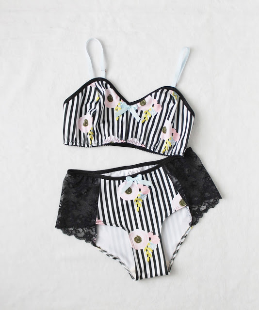 And lastly, something I’ve been wanting to do for a while is offer a few super-limited sets using fabrics from indie designers on Spoonflower. I so often get lost in the Spoonflower worm hole and end up losing hours looking at fabrics…  I really enjoy working with new fabrics so I’m buying just 1 or two meter cuts of these specialty prints. They cost a little more than my usual items, but they are truly unique and you will not only be supporting an indie lingerie designer, but also indie fabric designers!