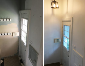 When I first saw our house I fell in love right away… You know how when you first start dating someone, you see all of their wonderful aspects, but it’s not until you’ve been dating for a while that you start to see their flaws? That happened with this house (ha!). I saw all of the wonderful bones of the house and some how didn’t notice until I moved in that the exterior was only half painted. Every single wall was half painted. It was like someone started painting all of the easy bits, then when the job got too high to reach, they stopped. In my defence, I was juggling a 1 year old, a business, and a pending nervous breakdown (only semi-joking). The side entry and kitchen also had some water damage, which was repaired by the seller prior to closing. Big mistake. The person who did the repair did a really crappy job. We’ve stayed dry, but the drywall job in the side entry was terrible. There were huge gaps between the door frame, baseboards and milk door that no one bothered filling and the side entry was left three different colours. It took me a good portion of a morning to fill and patch that area and we ended getting the painters who did the exterior of our house to paint this area white. The ceiling in this area was super high and would have been difficult to do on my own.