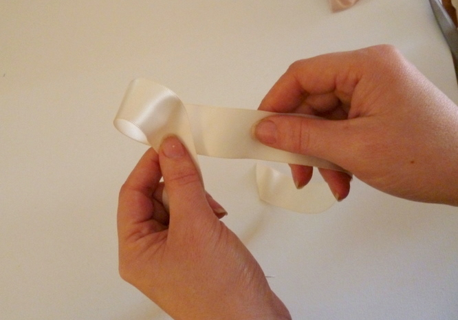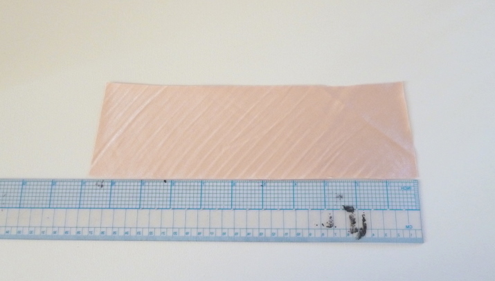 I cut a piece of satin on the bias, 1 1/2″ wide – adjust the width of yours depending on the width of the garter elastic ( I am using 3/8″ elastic). I didn’t use any particular length, I just cut a long strip, and made more as I needed.