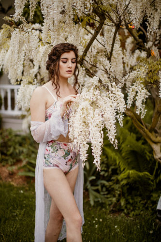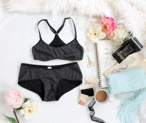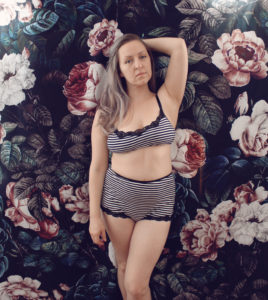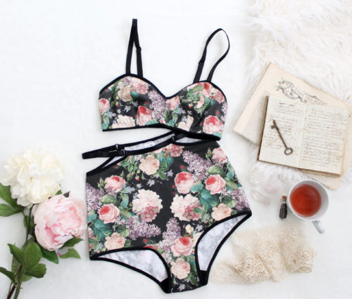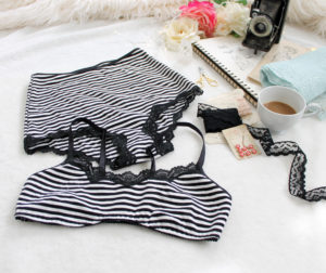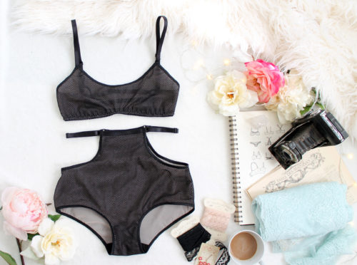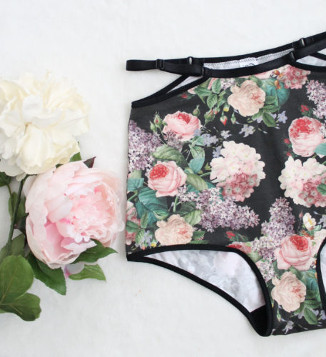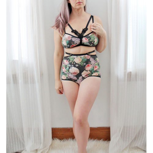 The Cedar Pattern has both a low and high neck variation. Both have a built in shelf bra. Before I had my reduction this was an absolute must have for me, but even now, with smaller boobs, the added support is nice. It has the option of either a full seat or thong back and I show two different ways of applying snaps at the gusset seam. The pattern works best with fabrics with 4 way stretch. I had a lot of fun sewing it with sheer mesh and lace but also sewed one out of velvet and another using a rib knit from Bibs & Boots Fabrics.