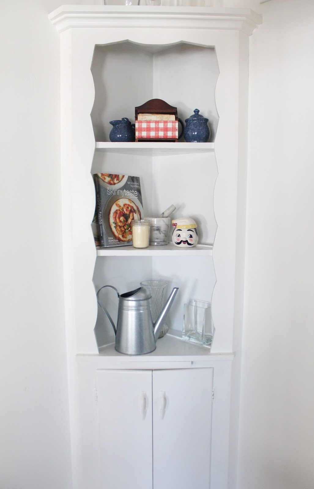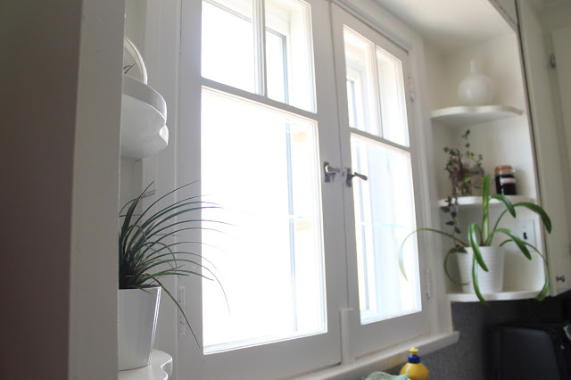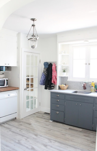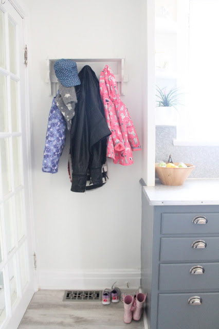 When I first saw our house I fell in love right away… You know how when you first start dating someone, you see all of their wonderful aspects, but it’s not until you’ve been dating for a while that you start to see their flaws? That happened with this house (ha!). I saw all of the wonderful bones of the house and some how didn’t notice until I moved in that the exterior was only half painted. Every single wall was half painted. It was like someone started painting all of the easy bits, then when the job got too high to reach, they stopped. In my defence, I was juggling a 1 year old, a business, and a pending nervous breakdown (only semi-joking). The side entry and kitchen also had some water damage, which was repaired by the seller prior to closing. Big mistake. The person who did the repair did a really crappy job. We’ve stayed dry, but the drywall job in the side entry was terrible. There were huge gaps between the door frame, baseboards and milk door that no one bothered filling and the side entry was left three different colours. It took me a good portion of a morning to fill and patch that area and we ended getting the painters who did the exterior of our house to paint this area white. The ceiling in this area was super high and would have been difficult to do on my own.