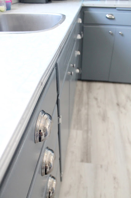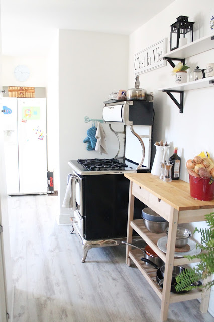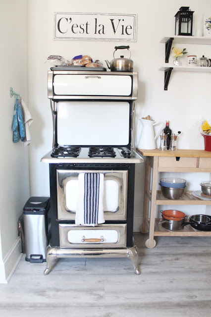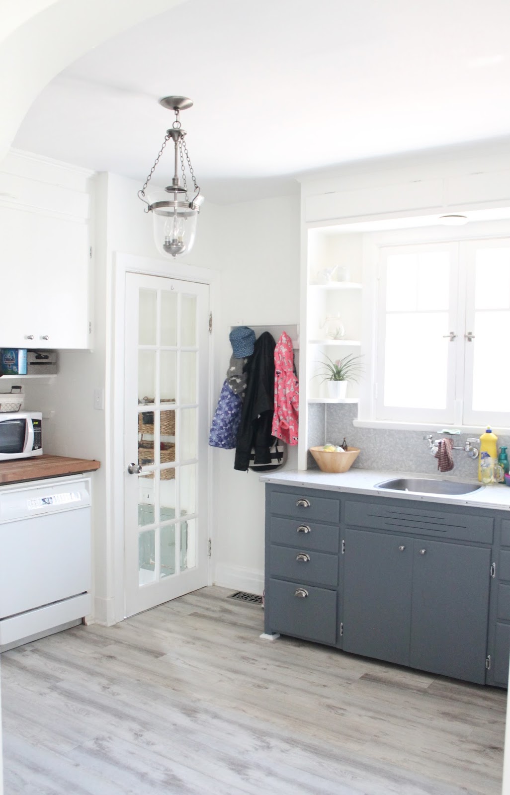 We had the exterior of the house painted white (actually a very very pale grey), and used a darker grey on the shutters. The wood shutters were in pretty rough condition, but with a little TLC, a lot of caulking and fresh paint they have a little more life left in them! I also painted the front door bright blue for a pop of colour. I love how it looks, fresh and modern colours on a traditional storybook cottage base. We also put up a new, more modern light fixture. We’re supposed to be having new soffit and fascia installed as ours is in very rough shape but I haven’t heard boo from the company we hired for a little while… So hopefully that is still happening!