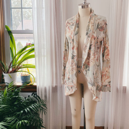 Cardigans are nice because the fit is fairly flexible. I’ve made the Calgary Cardigan from Pattern Niche for my mom and myself, using lightweight rib knits, french terry, and my favouite, double sided stretch minky (otherwise known as cuddle). The minky one is my favourite. It’s so cozy, it feels like I’m wearing a snuggly robe all day.
