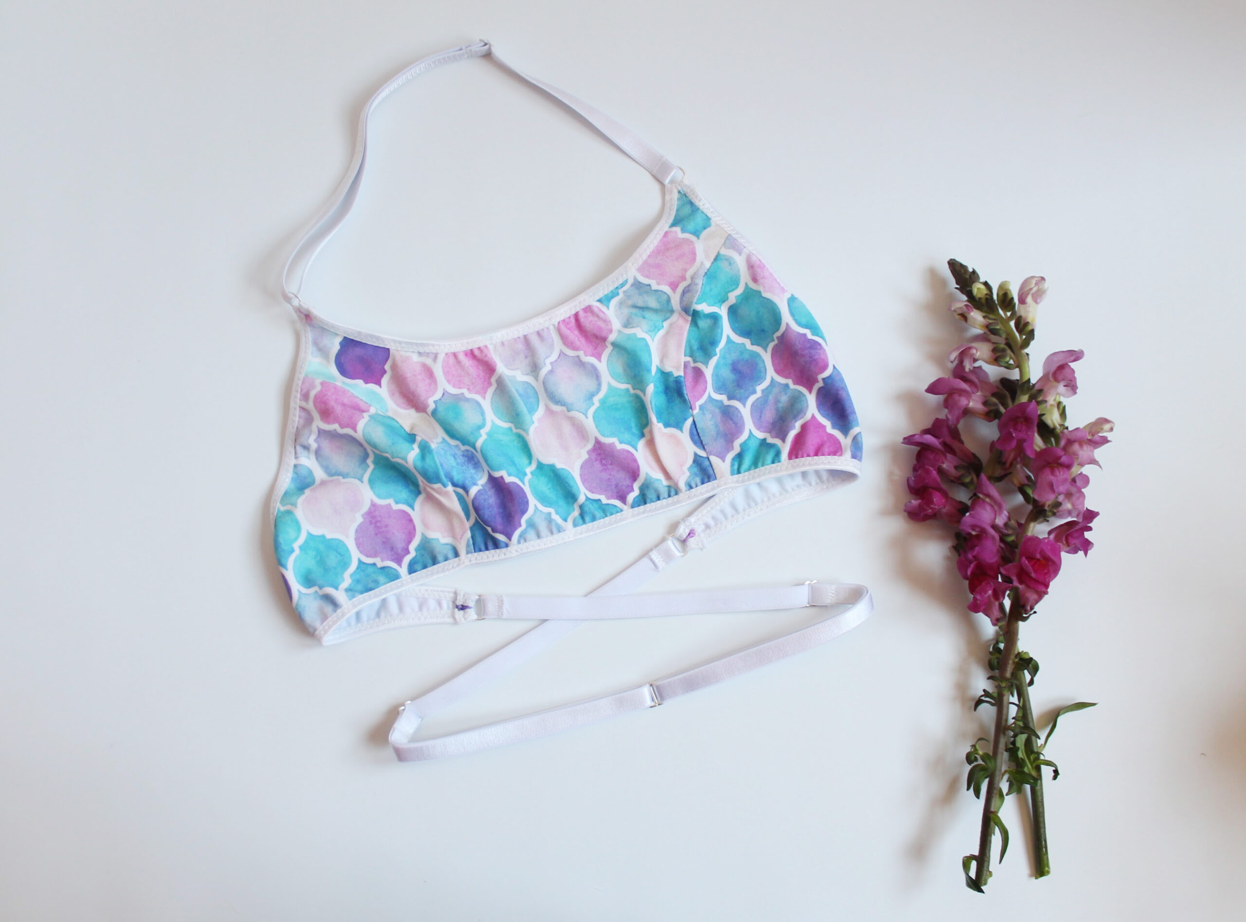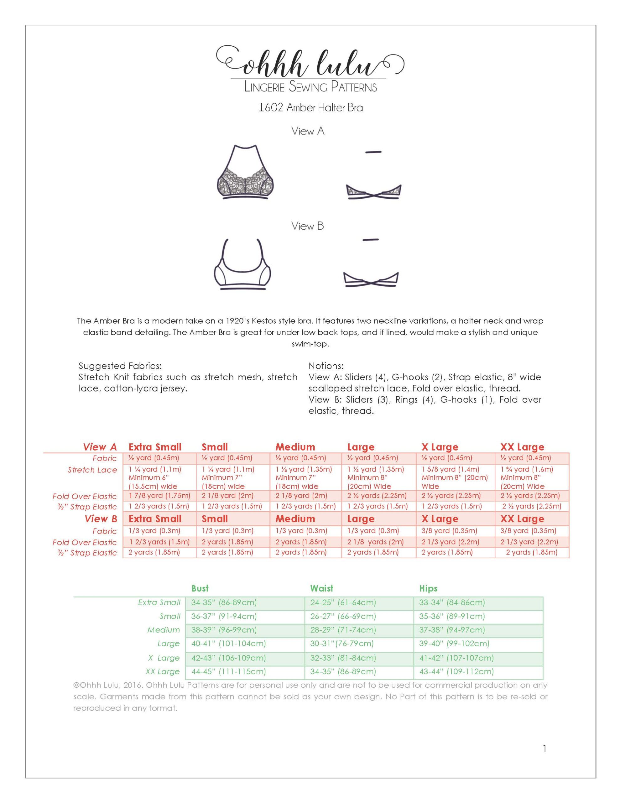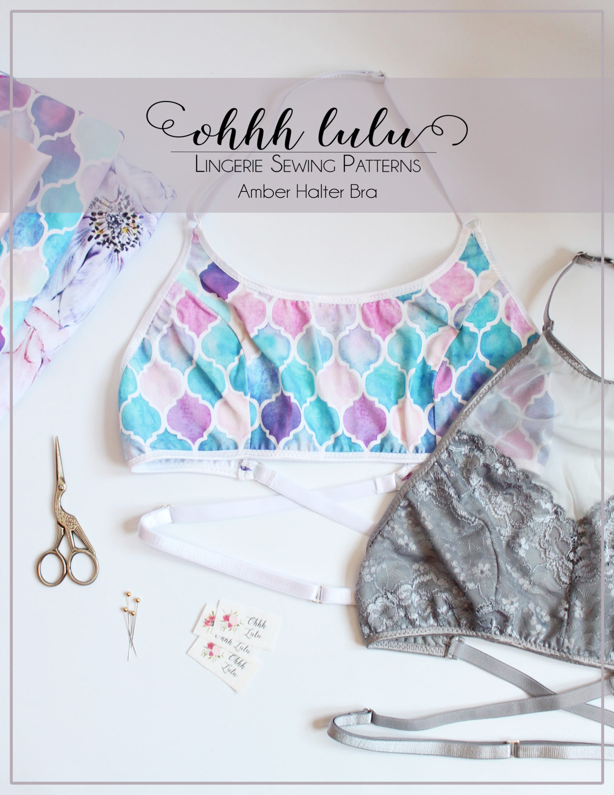 The Amber Bra was inspired by the Kestos bras of the 1920’s and 1930’s, with it’s wrap elastic detailing and soft, unstructured fit. It is a quick and easy style to sew with countless styling options to make your bra truly unique. Because of the nature of the adjustable straps, the Amber Bra offers an extremely flexible fit. Experiment with lace overlays, colour blocking, or strap variations. This pattern will work great under halter tops or tops with cut out backs. Try sewing one in swim spandex, lined with swim lining, for a sporty bikini top!