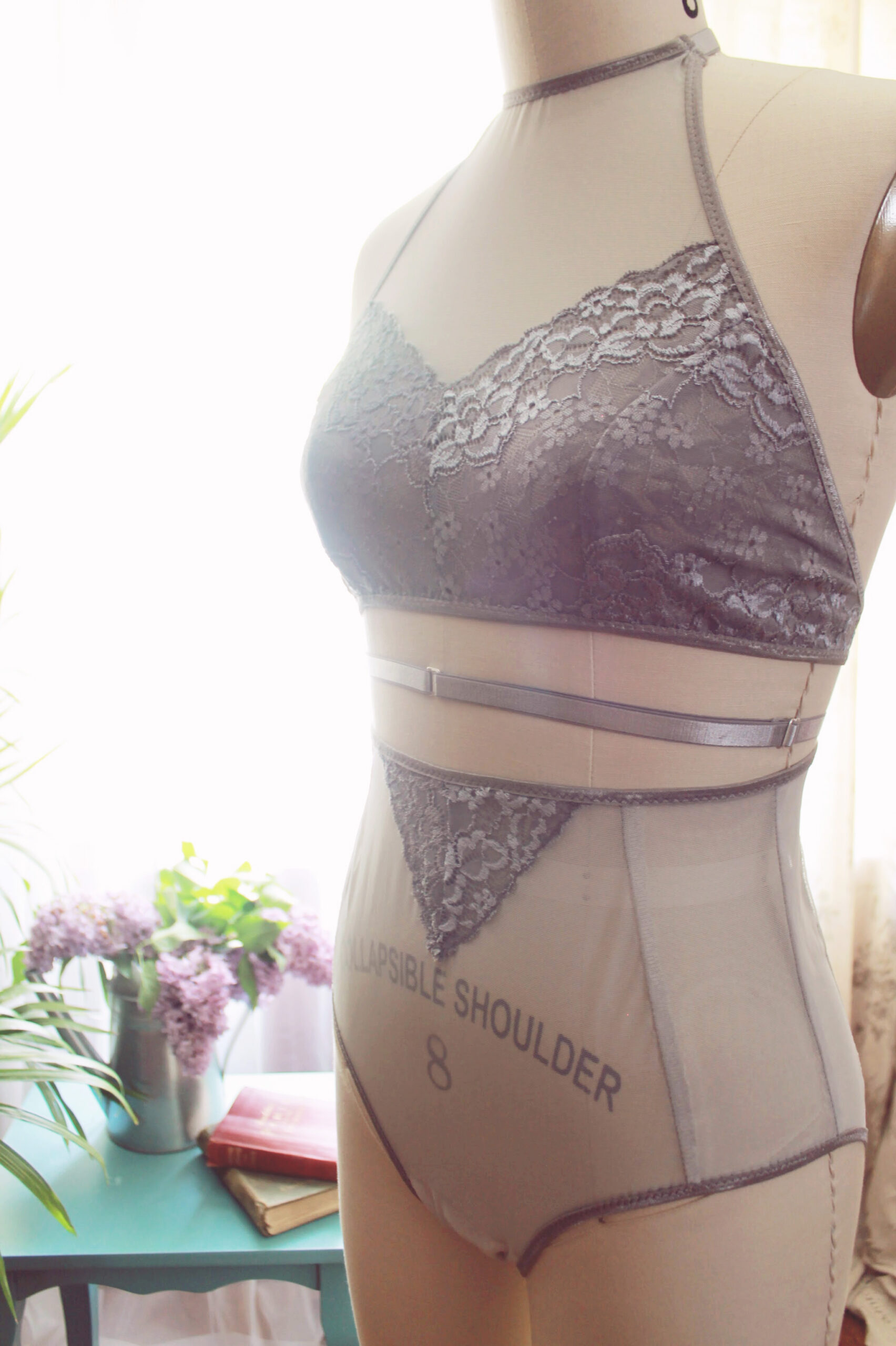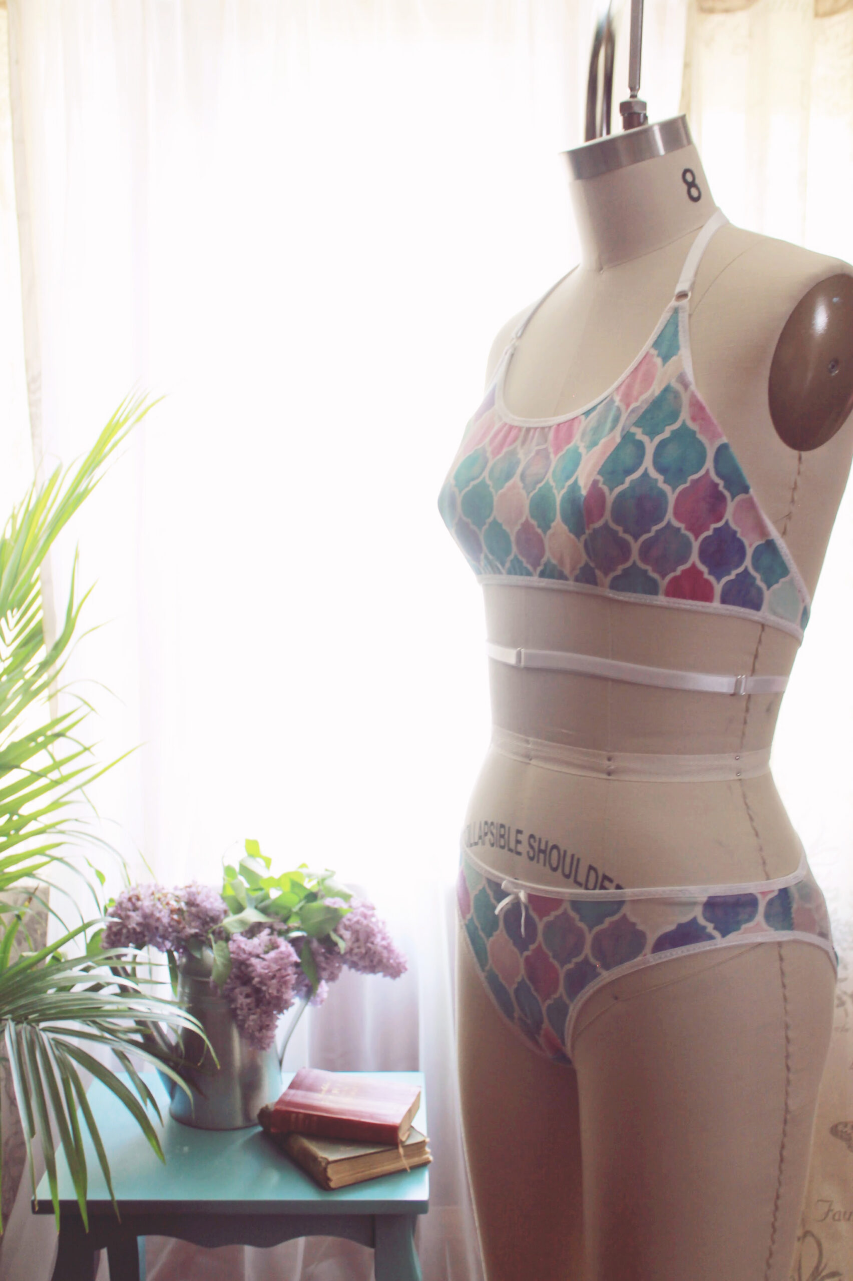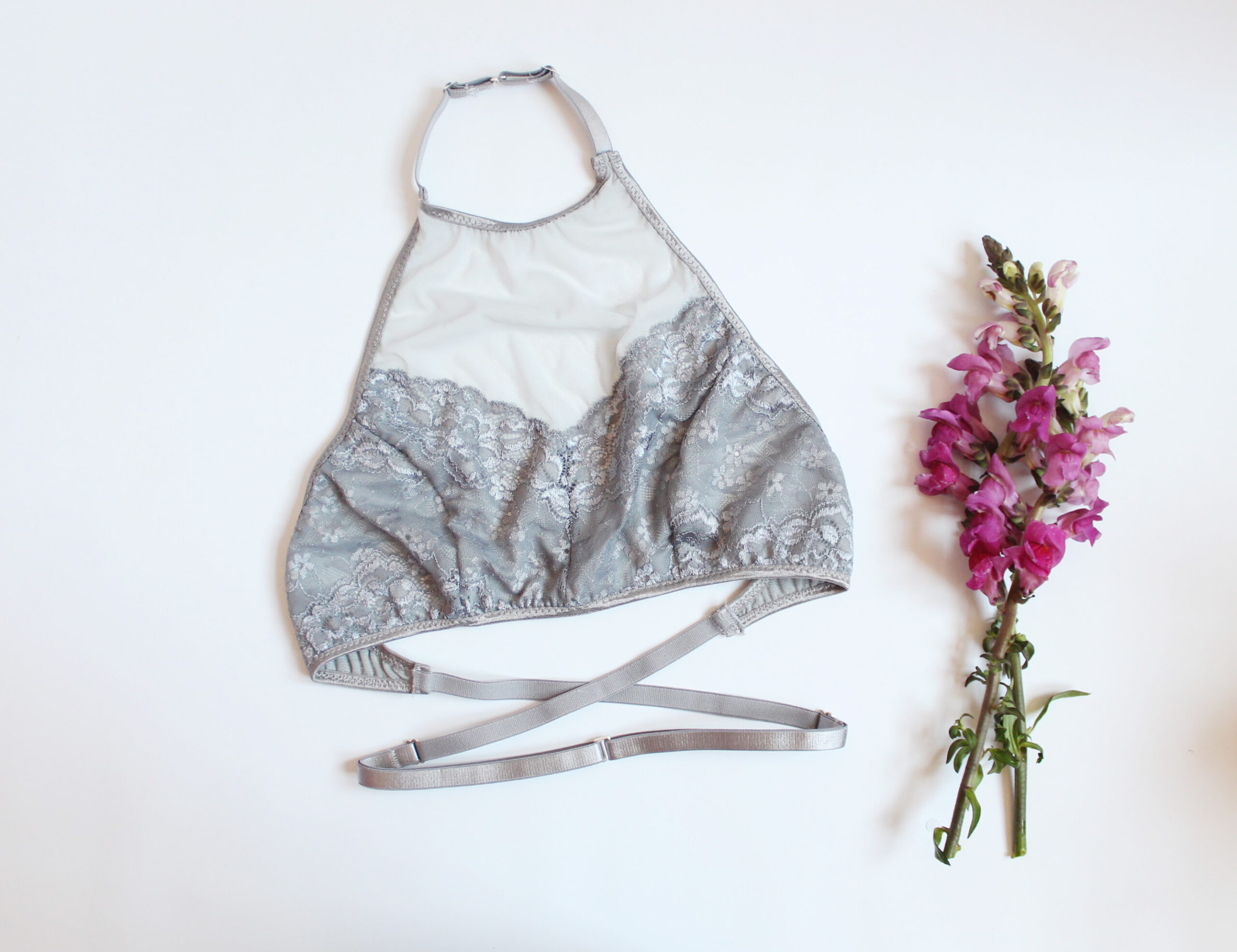 The Amber Bra was inspired by the Kestos bras of the 1920’s and 1930’s, with it’s wrap elastic detailing and soft, unstructured fit. It is a quick and easy style to sew with countless styling options to make your bra truly unique. Because of the nature of the adjustable straps, the Amber Bra offers an extremely flexible fit. Experiment with lace overlays, colour blocking, or strap variations. This pattern will work great under halter tops or tops with cut out backs. Try sewing one in swim spandex, lined with swim lining, for a sporty bikini top!