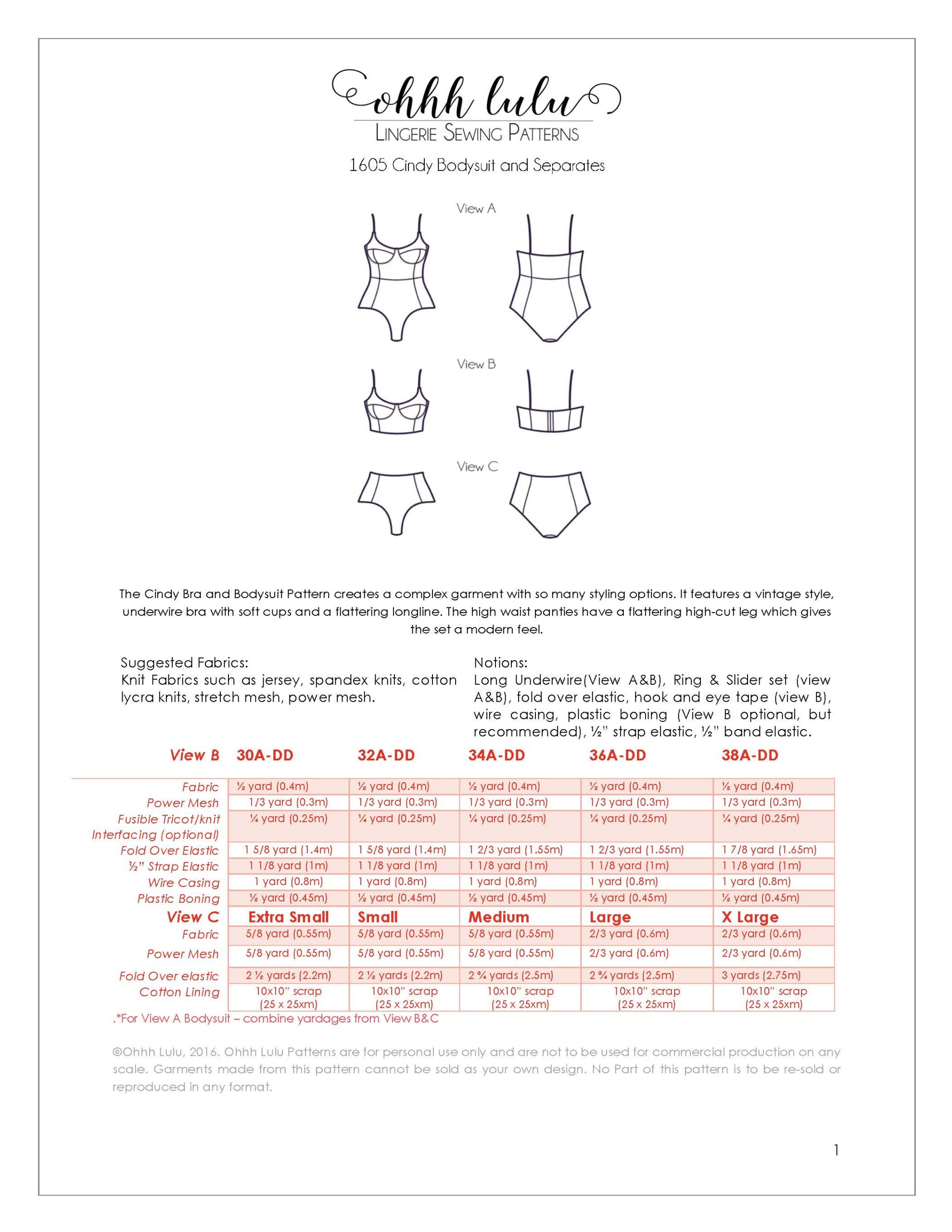 This is an intermediate to advanced level pattern. While the instructions do cover how to apply elastics and underwire casings, some knowledge of bra making is helpful. The Bodysuit Version requires pattern manipulation, which is outlined in the instruction booklet.