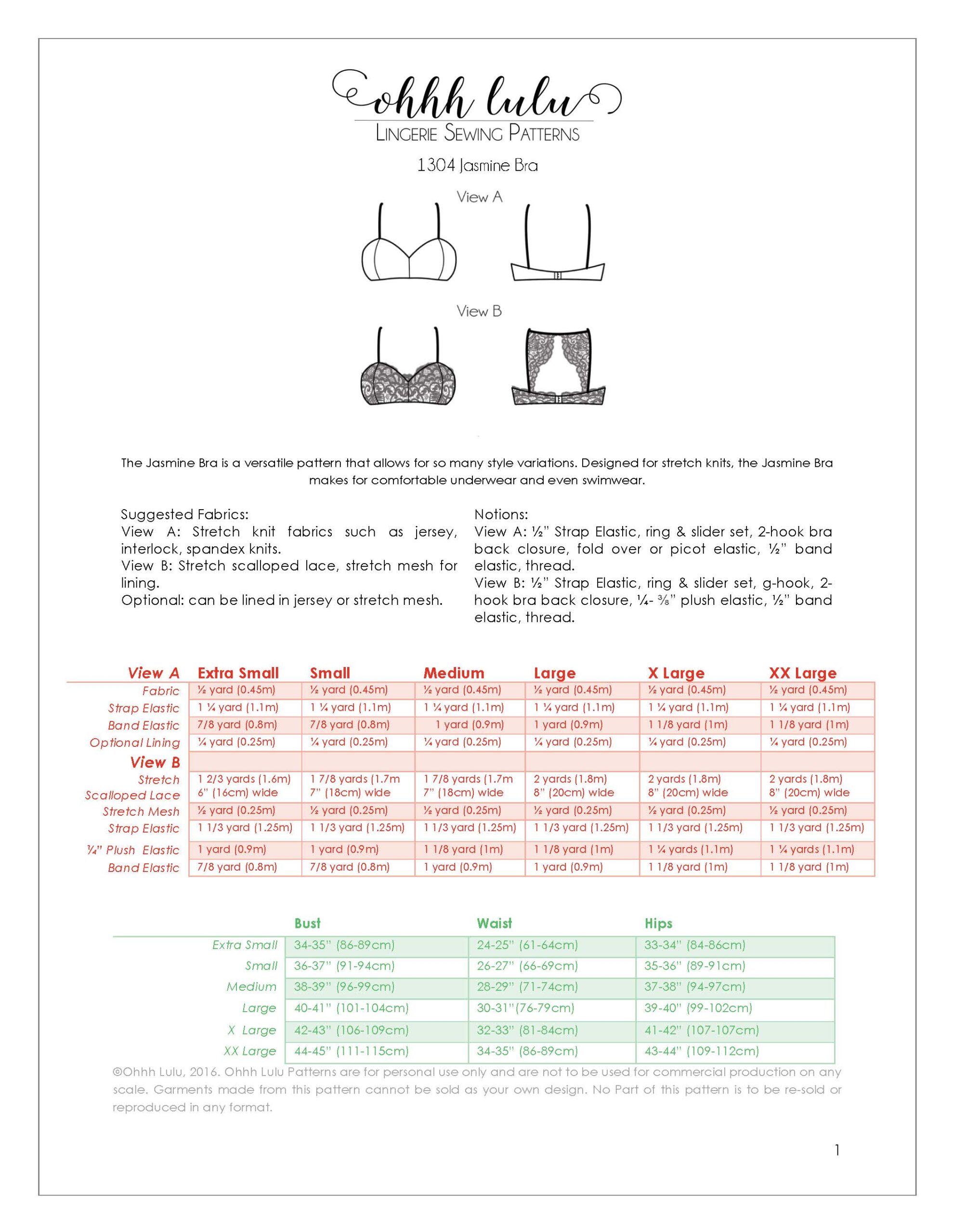 Jasmine Bra Pattern XS-2XL in Standard and Large DD+ Cup Sizes