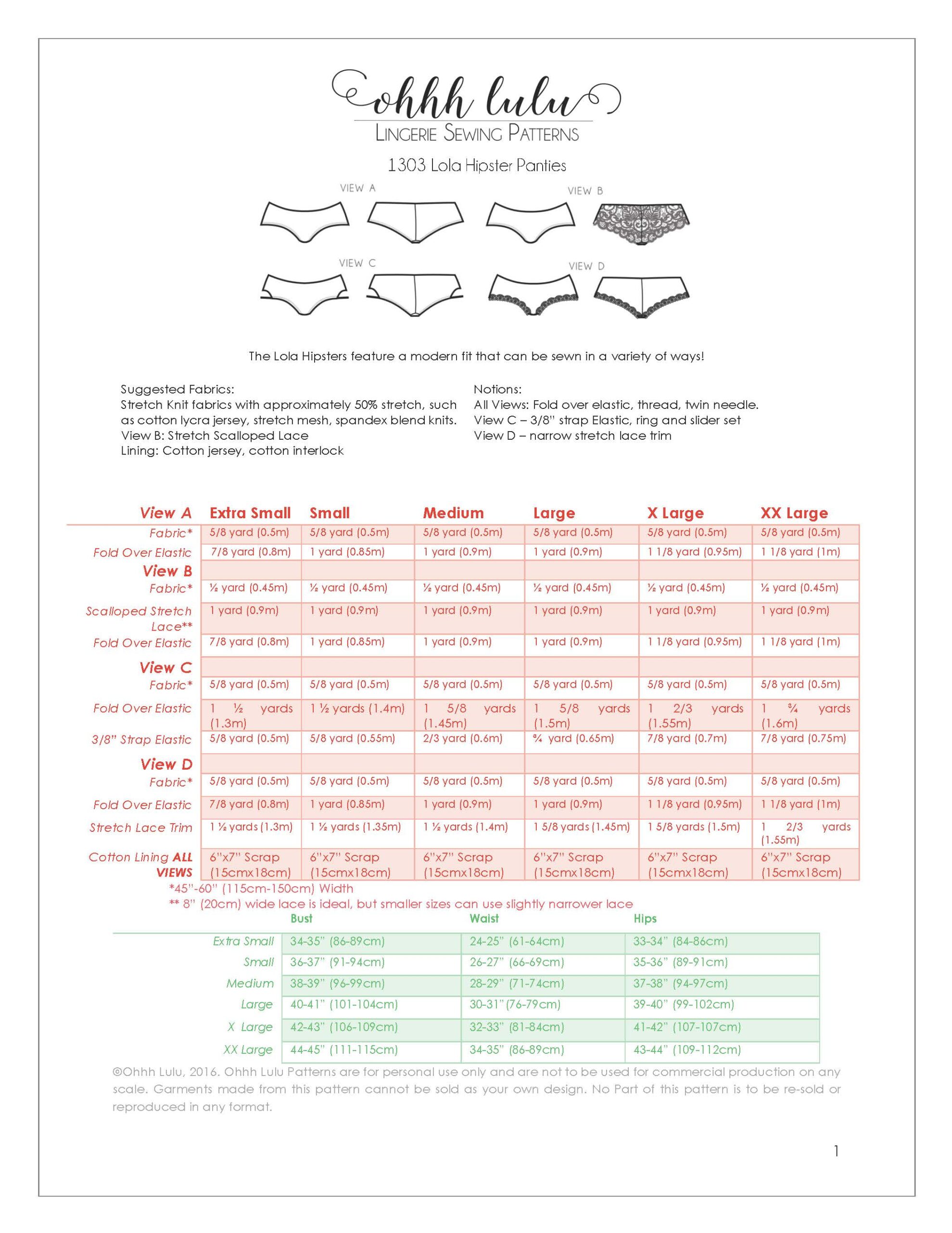 The Lola Panties have a modern hipster cut with a cheeky back with a boy-leg style front. These snug-fitting undies are designed to be sewn with a simple hemmed leg line, but these instructions will walk you through how to sew them with a sexy strappy cutout, lace trimmed legs, and a cheeky lace back. To view a video tutorial on how to sew the Lola Panties, please visit my YouTube Channel (https://youtu.be/y_9LONuPEUI).