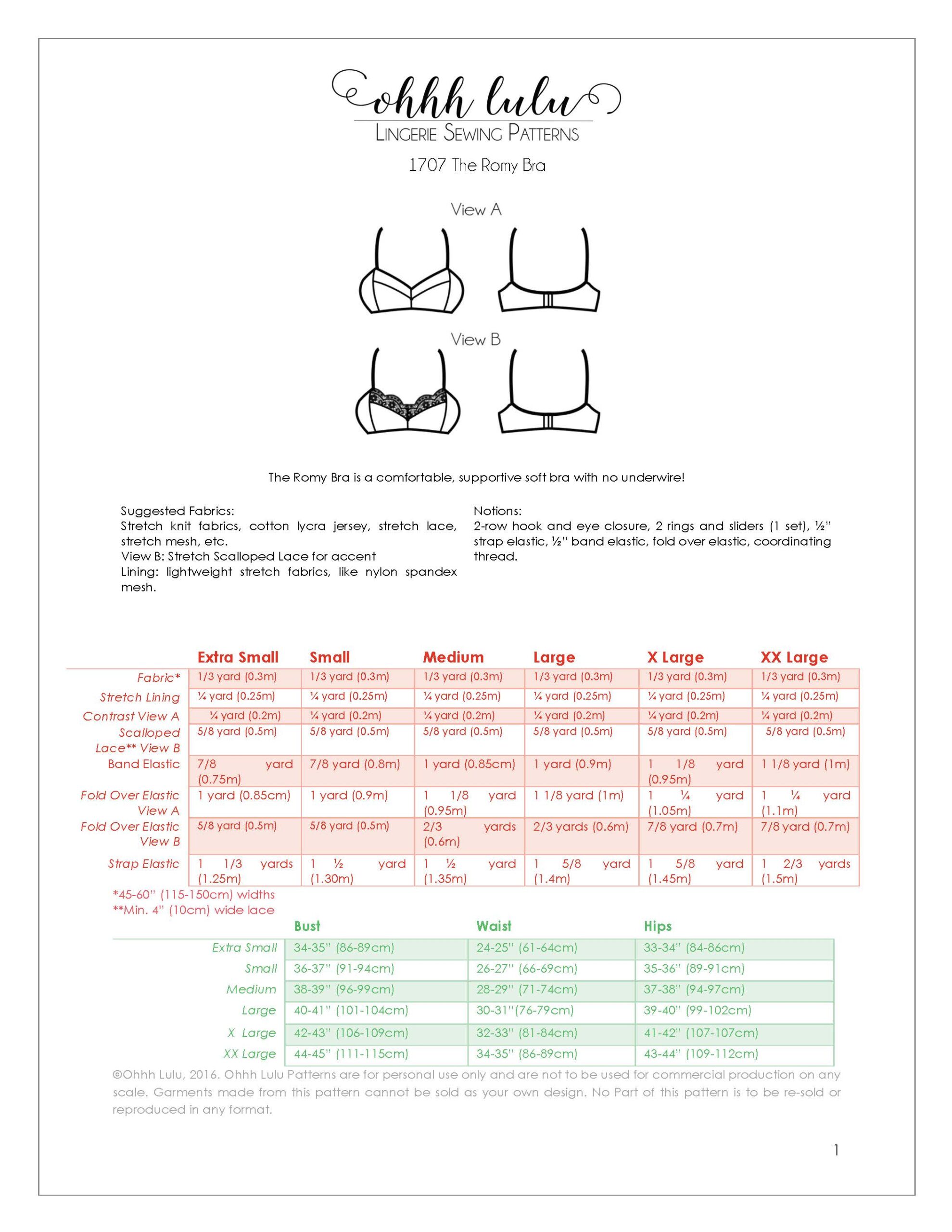 The Romy Bra is a step up in complexity from the Jasmine Bra. It features a 3-piece cup, and shaped wing. These instructions will walk you through how to sew the bra with a simple fold over elastic neckline or a lace neckline, as well as a BONUS strappy neckline. The Romy Bra is finished on the inside with a clean-finish lining, but you can omit this if you are looking for a very quick and simple sew! For a full how-to video tutorial, please visit my YouTube Channel (https://youtu.be/CMBO94zpAx8).