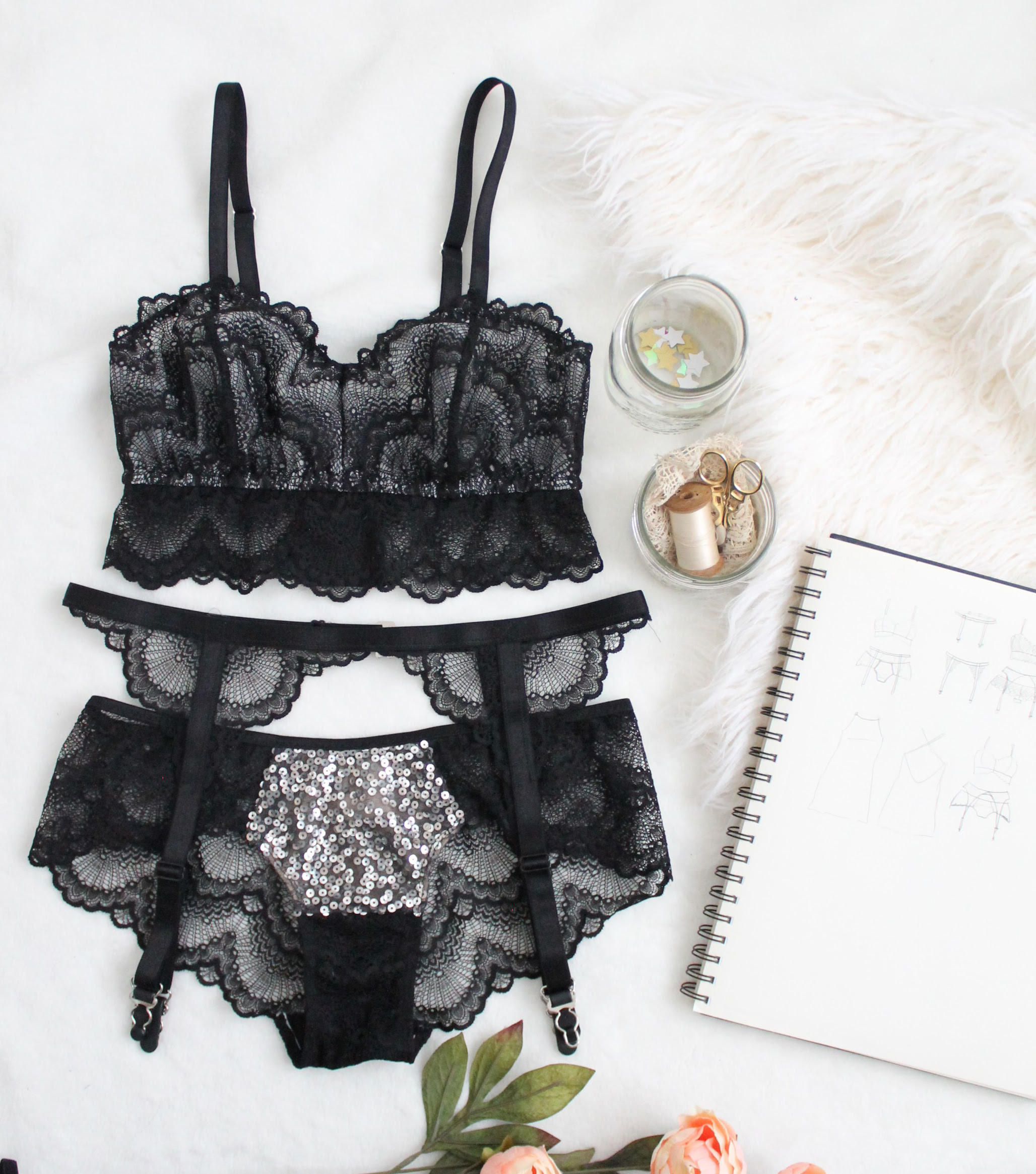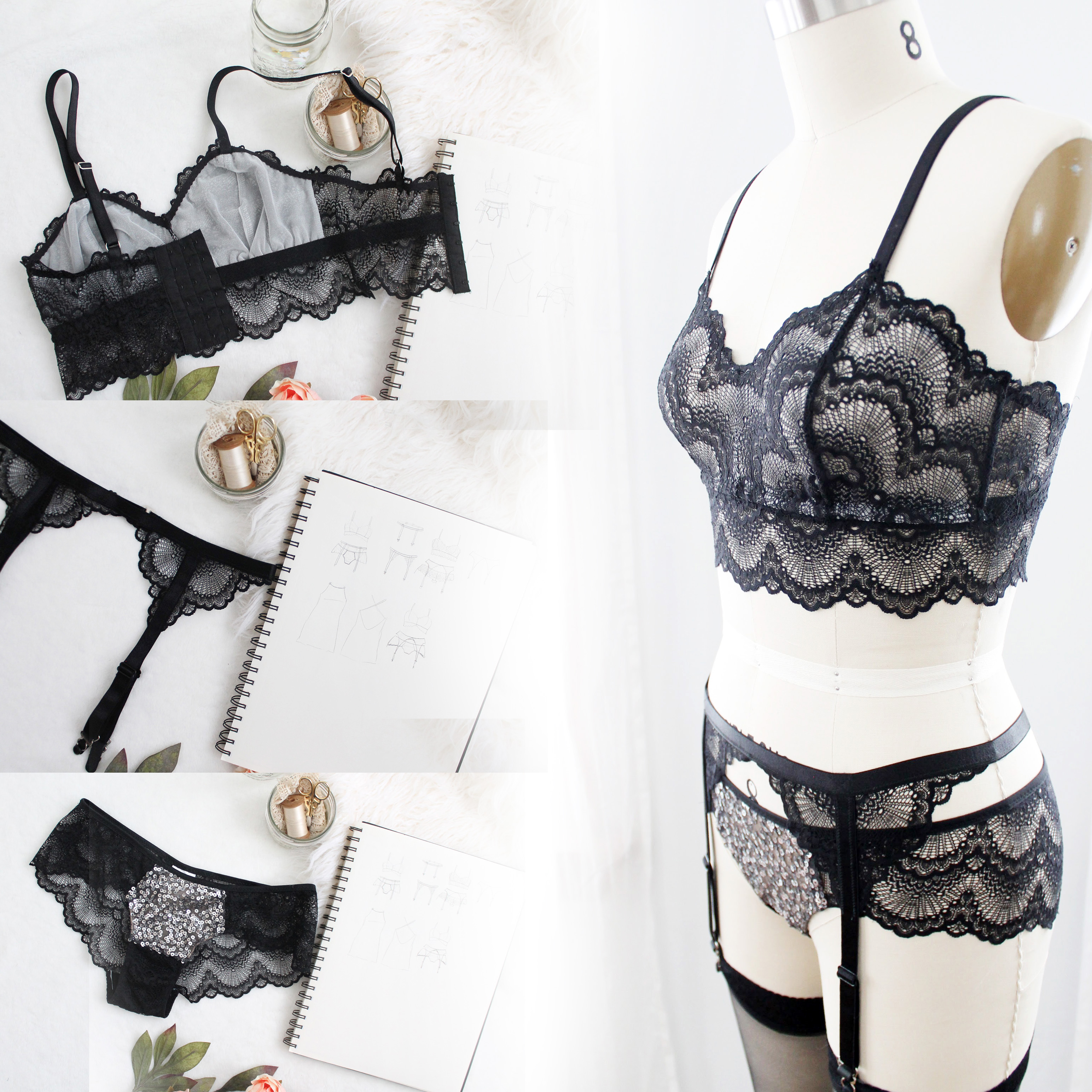 As part of the sew along, we will learn how to add a longline lace band to the Jasmine Bra, and how to add a sequin panel to the front of the Claudia Panties.