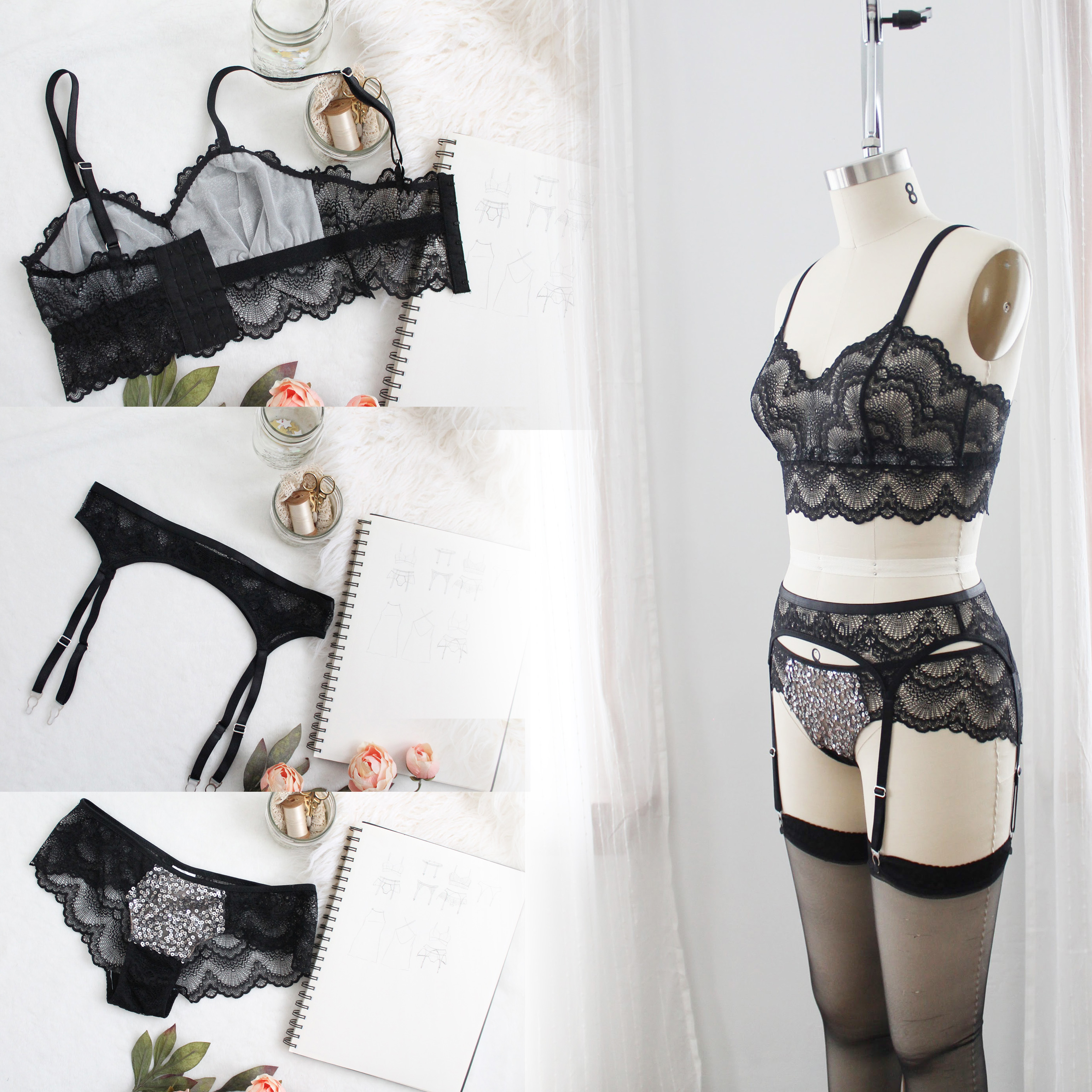 As part of the sew along, we will learn how to add a longline lace band to the Jasmine Bra, and how to add a sequin panel to the front of the Claudia Panties.