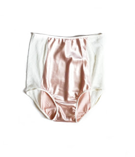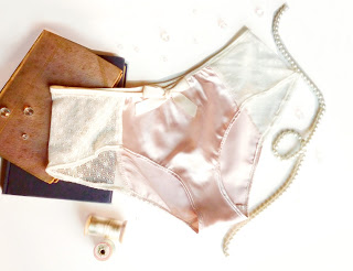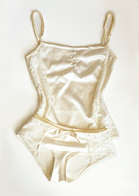 These ribbon-tied panties are made of stretch satin in petal-pink, and chiffon rosette covered mesh. These would make a great bridal boudoir piece. Wish I had them for my wedding *whine*