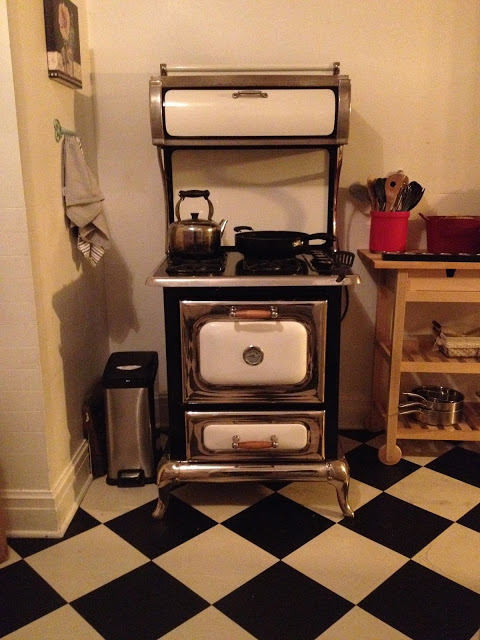 I’ve also been working hard trying to clean up our old Heartland Stove. It was/is very, very dirty. I’m very conflicted about this range. I’m sure it was expensive when it was purchased. It is very small. I like the gas cook top (though I burned every grilled cheese I made for the first month). I don’t like the empty space above it.  I miss my old stainless steel, brand new appliances… but I’m getting used to it and I’m really trying to love this stove. I’m struggling trying to figure out how to dress up the space around it. The “hall” to the right of it is a fairly large open space.  We’ve put an Ikea island there for now and plan on putting some shelving above it… Does anyone else have one of these repro ranges? How did you style it? I’m not digging it’s location but it’s the only place that has a gas hook-up.